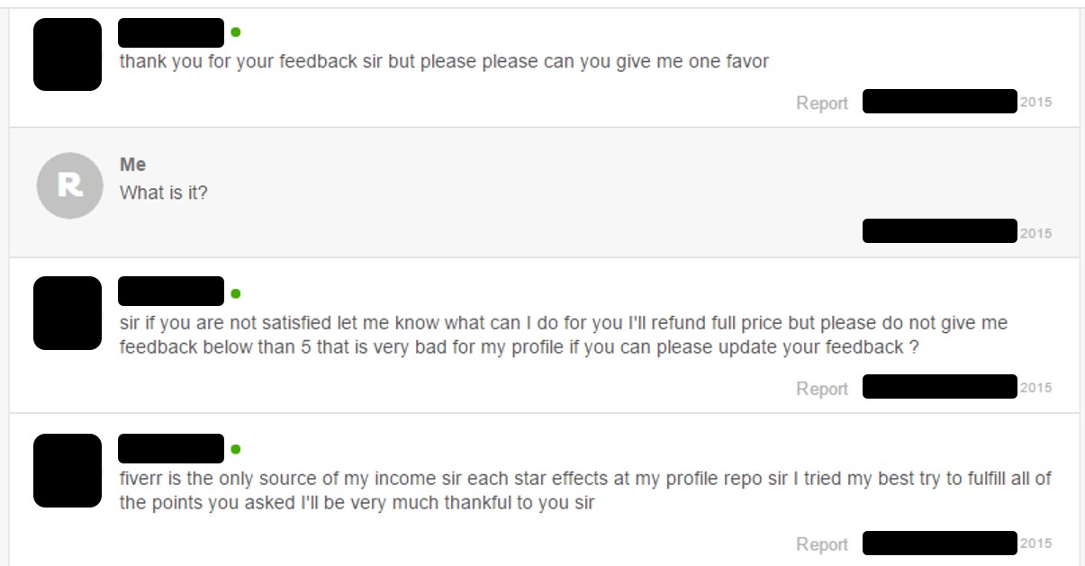 An hour later, the designer sent me a special plea. She asked me, practically in virtual tears, to remove my review, telling me that we can cancel the order and go to our separate ways. She told me that her livelihood depends on Fiverr, and without high ratings, she would not be approached by other buyers in the future.